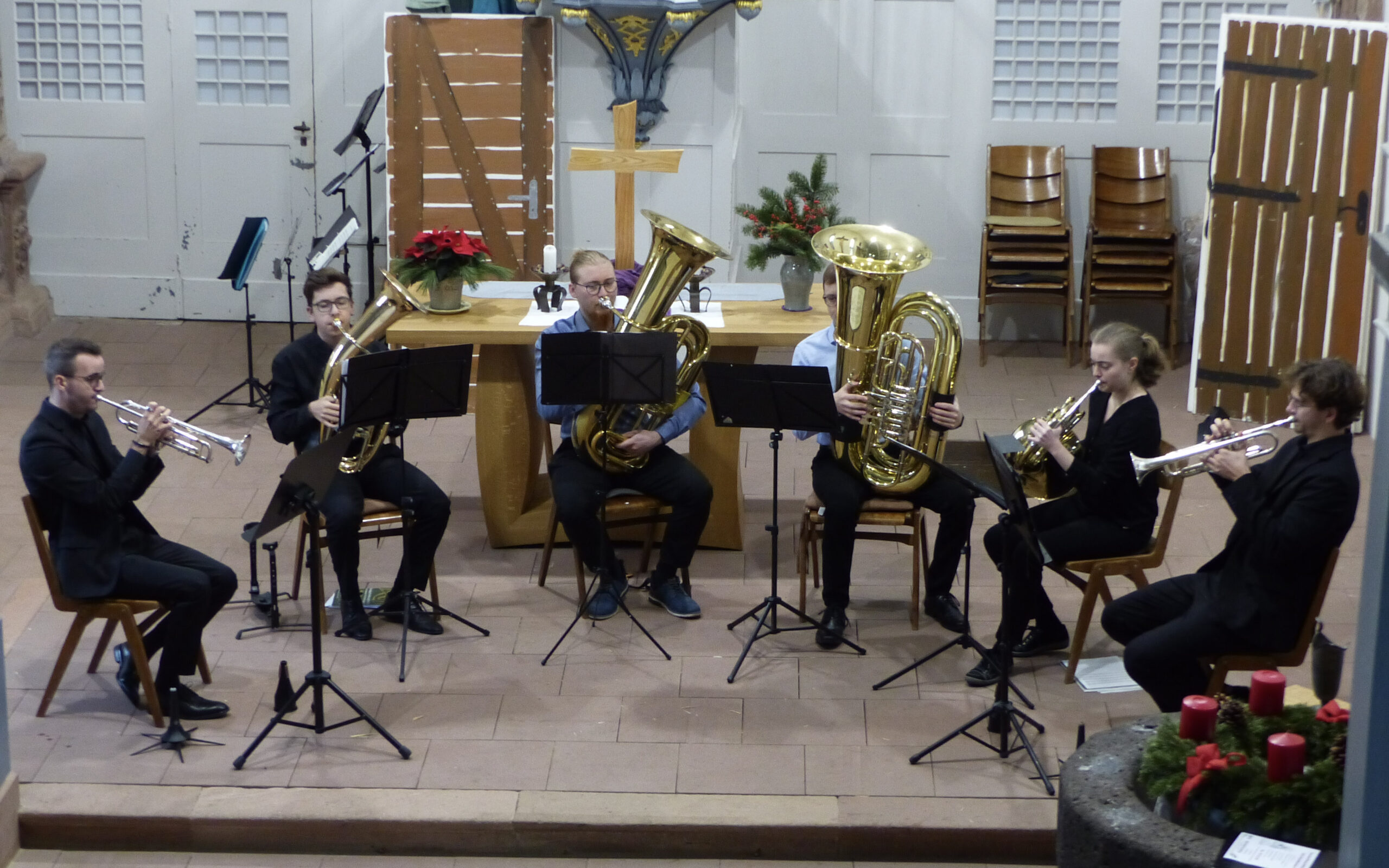 Da das vorgesehene Saxophonensemble krankheitsbedingt ausfiel, eröffnete das Blechbläserquintett (Leitung Roman Mixa) mit einem Renaissance-Tanz von Tilman Susato, es folgten „You raise me up“ und Leonhard Cohens „Hallelujah“. Ein Violoncello-Trio mit Talita Kroeker, Henry Trageser und Leon Craul (Klassen Bettina Hey und Daniela Craul) überzeugte mit Tschaikowskys „Großvatertanz“ und einem französischen Weihnachtslied.
